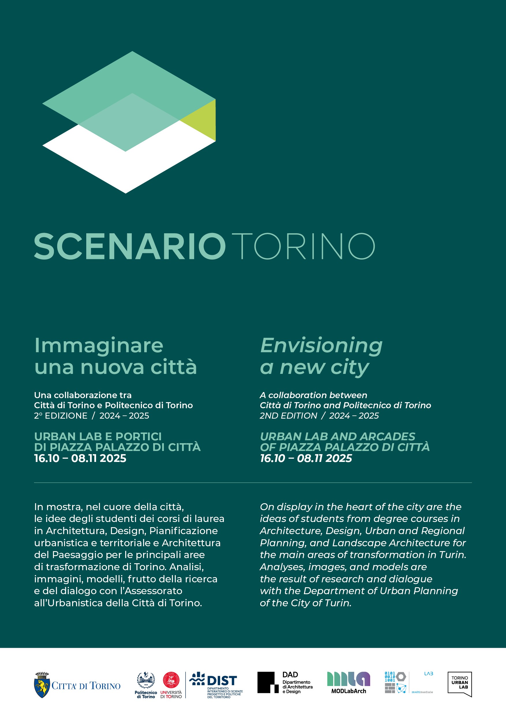 La mostra "Scenario Torino. Immaginare una nuova città" nasce dalla collaborazione tra Città di Torino e Politecnico di Torino e raccoglie analisi, immagini e modelli dedicati alle principali aree di trasformazione urbana della città, frutto di un intenso lavoro di ricerca e del dialogo con l’Assessorato all’Urbanistica della Città di Torino.
