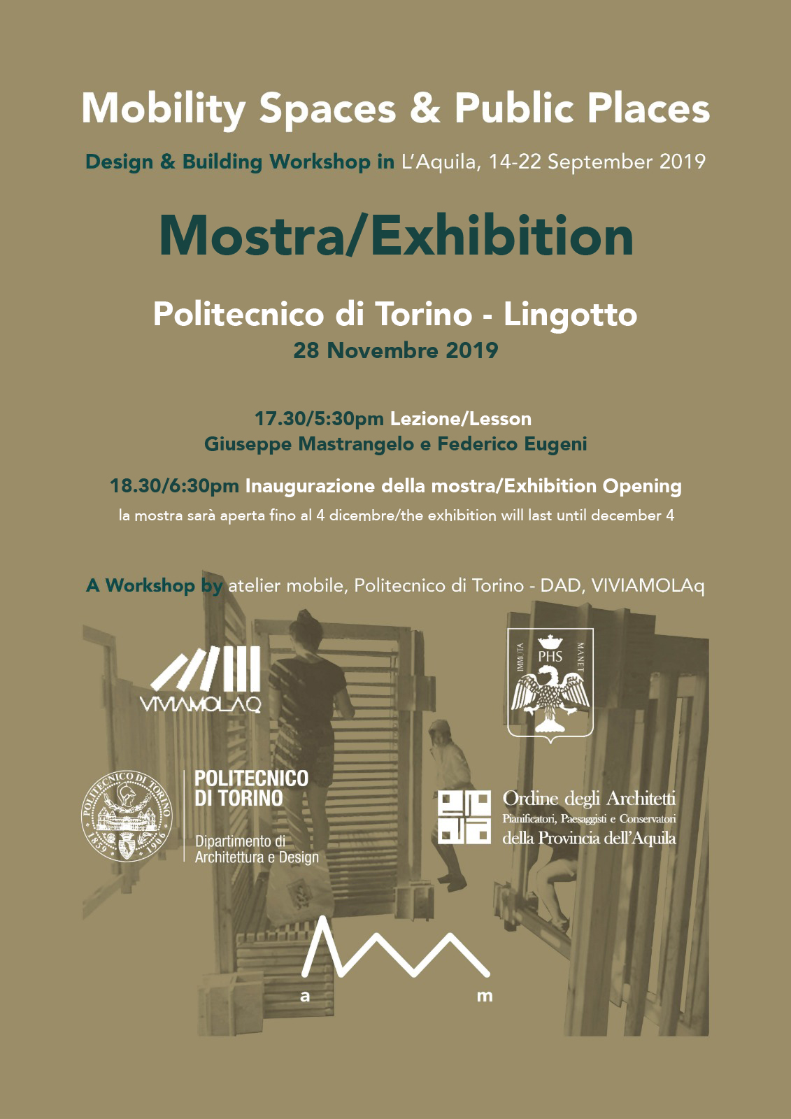 La mostra illustra i lavori del workshop di design+build svoltosi a L'Aquila lo scorso settembre, che ha portato alla realizzazione di una struttura in legno che ha trasformato una fermata del bus in un luogo di sosta e attesa aperto verso il paesaggio.