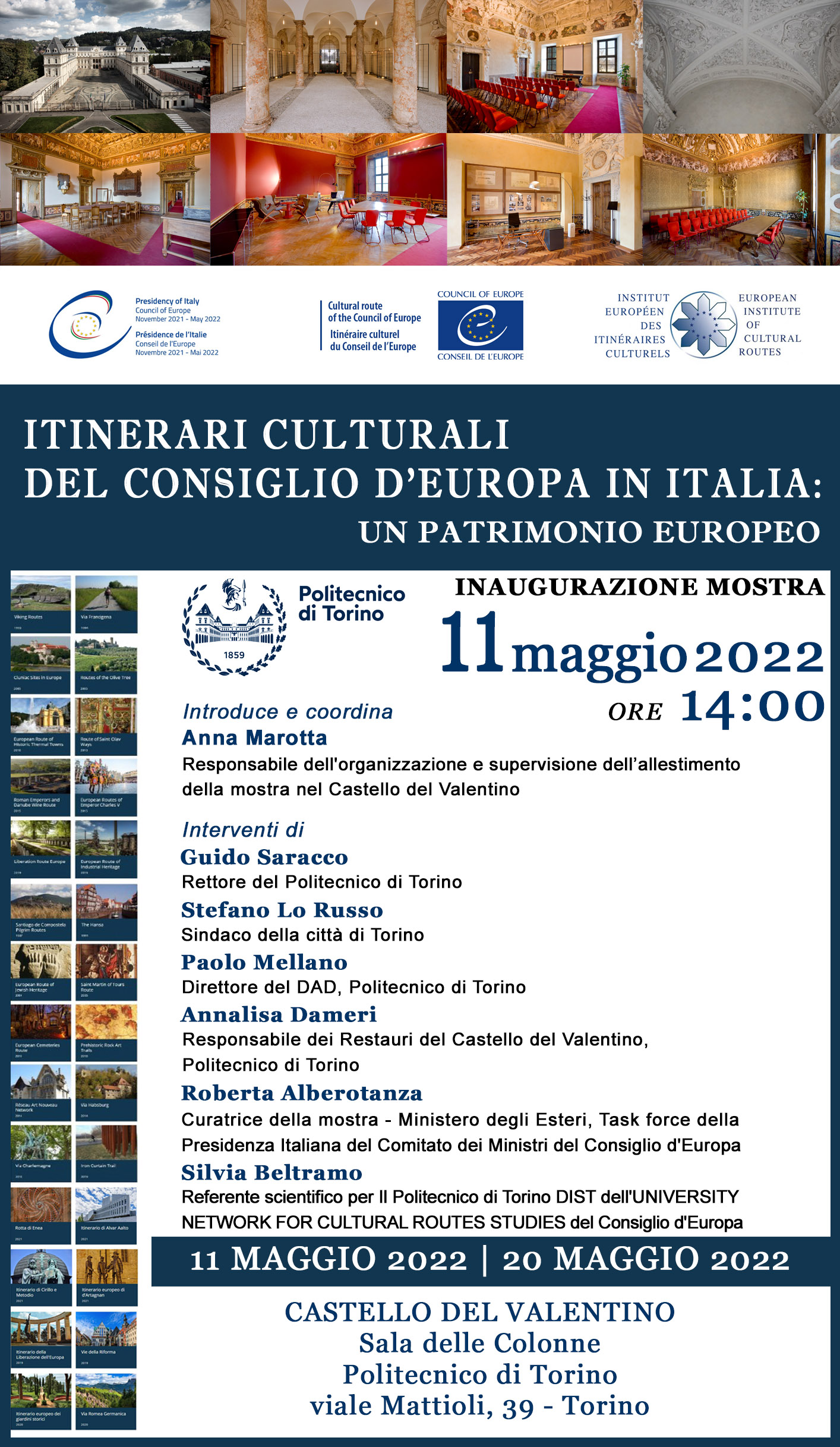 In occasione del semestre di Presidenza italiana del Comitato dei Ministri del Consiglio d’Europa, il Politecnico ospiterà al Castello del Valentino la mostra sui 29 Itinerari Culturali in Italia, che fanno parte dei 45 itinerari complessivi riconosciuti in Europa grazie al Programma degli Itinerari Culturali avviato nel 1987 con la Dichiarazione di Santiago di Compostela.