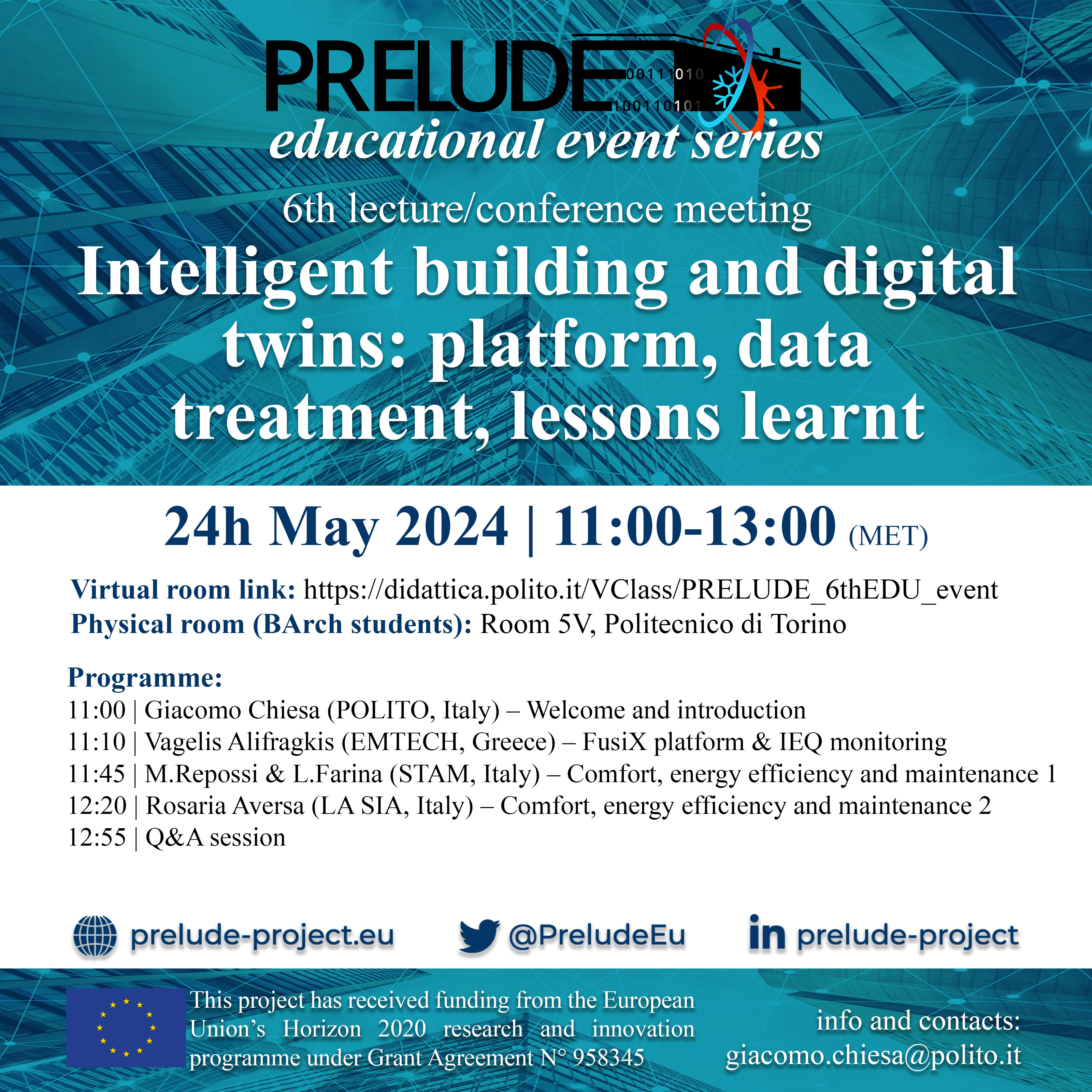 The PRELUDE project - Prescient building Operation utilising Real-Time data for Energy Dynamic Optimization – aims to support advanced innovative, smart, low-cost solutions supporting intelligent buildings and proactive optimisation services. Among the others, the project pursues the minimisation of energy uses, the maximisation of self-consumption and renewable sources balance, and the improvement of comfort conditions supporting the maximisation of free-running building potentials. This event is the sixth of a series of lectures/conferences on smart building issues, climate-free-running building design, and operational solutions. This lecture/conference focuses on energy and comfort in building management platforms, discussing some of the novelties introduced and tested during the PRELUDE project. Contents focus on lessons learnt, including predictive maintenance, BIM and digital twins, user comfort optimisation, user energy profile optimisation, energy and comfort monitoring platforms, middleware and data treatment issues. Results include demo buildings in different countries and discussion of platforms, systems, and GUIs. Speakers are recognised professional experts in the topic.