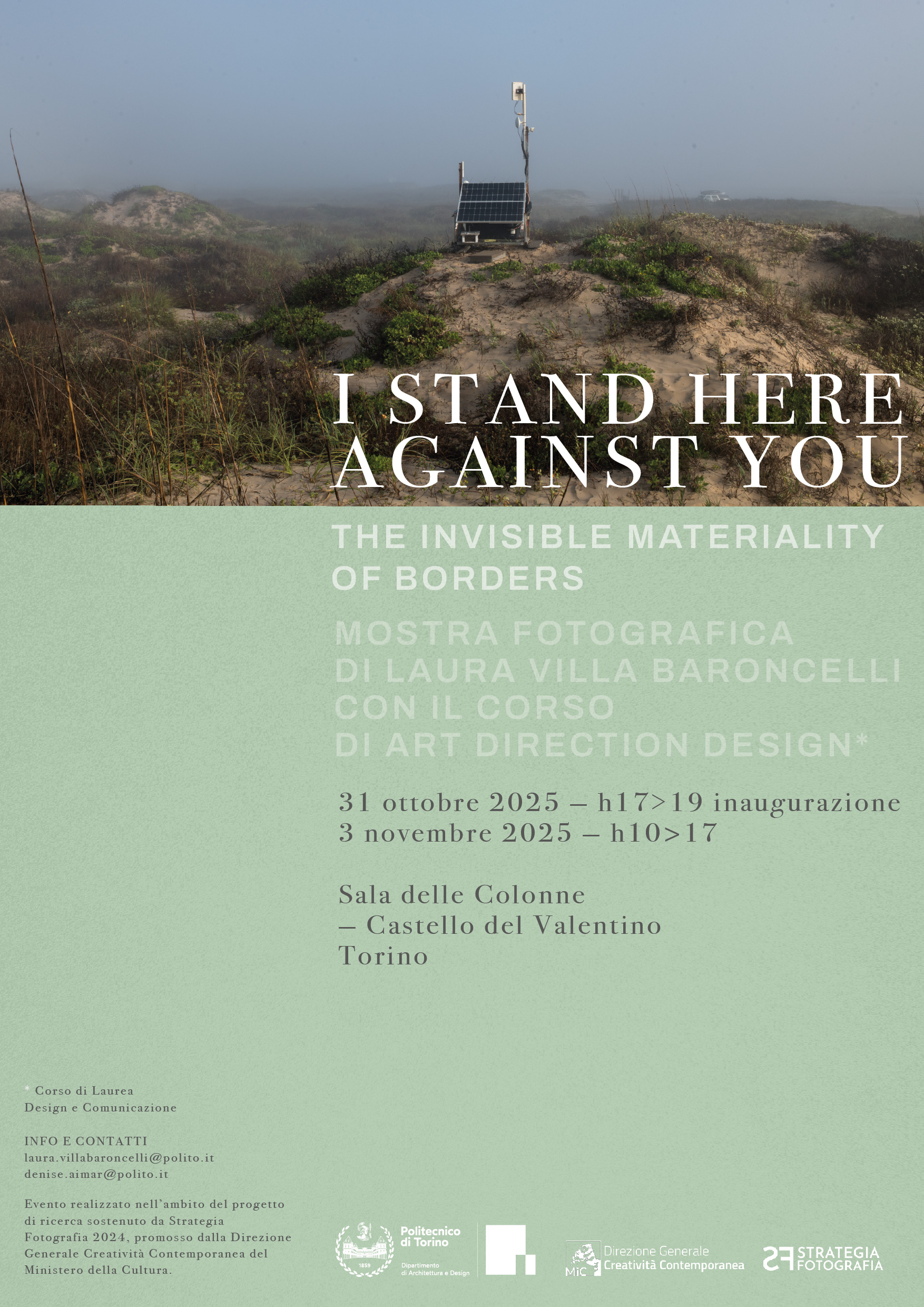 La mostra I STAND HERE AGAINST YOU – The Invisible Materiality of Borders, ospitata al Castello del Valentino il 31 ottobre e il 3 novembre, presenta la ricerca fotografica di Laura Villa Baroncelli sull’ambiguità delle frontiere contemporanee, che oggi si manifestano attraverso dispositivi tecnologici distribuiti e infrastrutture spesso invisibili. In dialogo con questa ricerca, una selezione di lavori sviluppati dagli studenti del corso di Art Direction Design 2025 esplora i confini invisibili della città di Torino, rivelando barriere sottili, soglie ambigue e forme di deterrenza che incidono sui nostri movimenti e sulla percezione dello spazio urbano. Il progetto di ricerca è sostenuto da Strategia Fotografia 2024, promosso dalla Direzione Generale Creatività Contemporanea del Ministero della Cultura.
