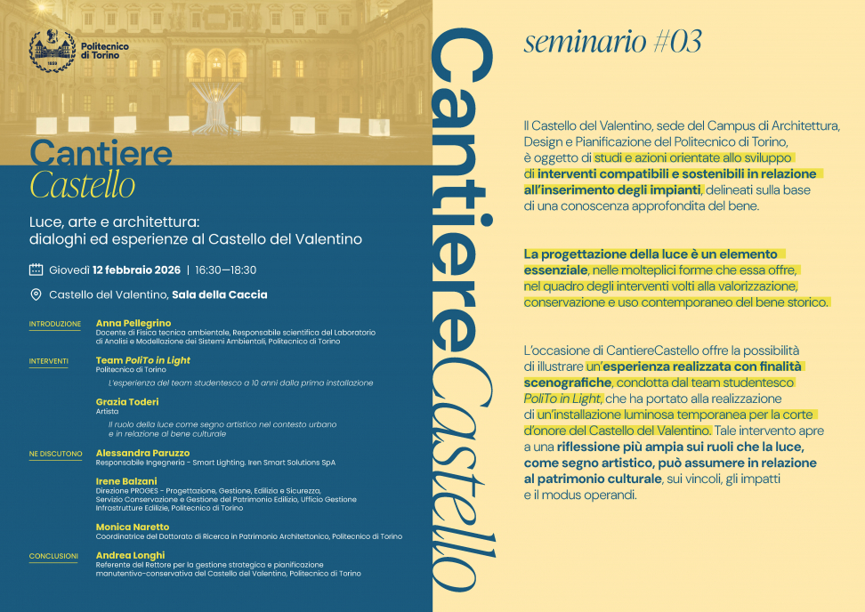 L’occasione di CantiereCastello offre la possibilità di illustrare un’esperienza realizzata al Politecnico di Torino negli ultimi dieci anni, condotta dal team studentesco PoliTo in Light, che ha portato alla realizzazione di un’installazione luminosa temporanea per la corte d’onore del Castello del Valentino. Tale intervento apre a una riflessione più ampia sui ruoli che la luce, come segno artistico, può assumere in relazione al patrimonio culturale, sui vincoli, gli impatti e il modus operandi.