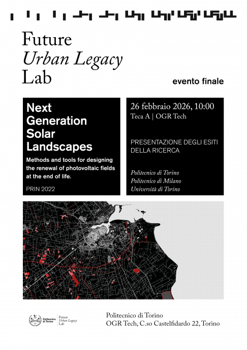 Giovedì 26 febbraio 2026, alle ore 10,00, si terrà l'evento finale di disseminazione degli esiti della ricerca PRIN 2022 - Next Generation Solar Landscapes. Metodi e strumenti per il progetto dei paesaggi solari di nuova generazione: il caso del rinnovamento dei campi fotovoltaici a fine vita, finanziata dal Ministero dell’Università e della Ricerca (MUR).