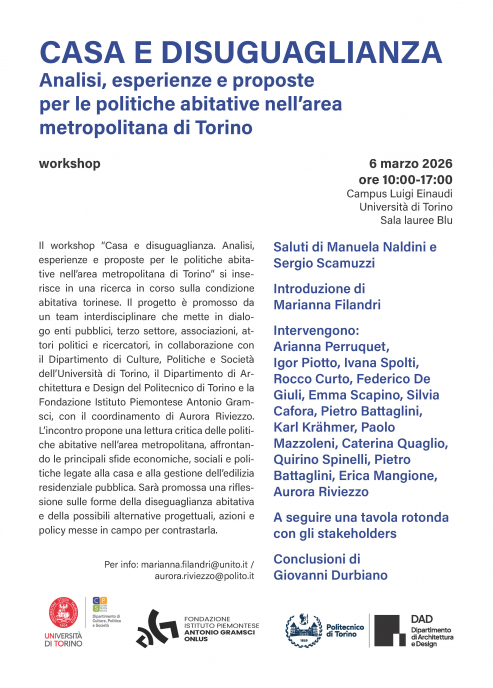 Il workshop “Casa e disuguaglianza. Analisi, esperienze e proposte per le politiche abitative nell’area metropolitana di Torino” si inserisce in una ricerca in corso sulla condizione abitativa torinese.