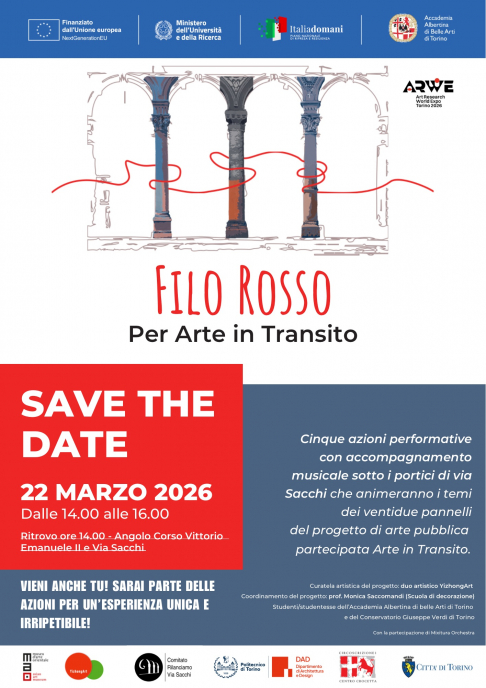 Filo Rosso per Arte in Transito nasce in occasione del progetto ARWE Art Research World Expo 2026, all'interno del programma INAR – Italian Network of Artistic Research, promosso dall'Accademia Albertina di Belle Arti di Torino, vincitrice del bando PNRR per l'internazionalizzazione delle istituzioni AFAM.
