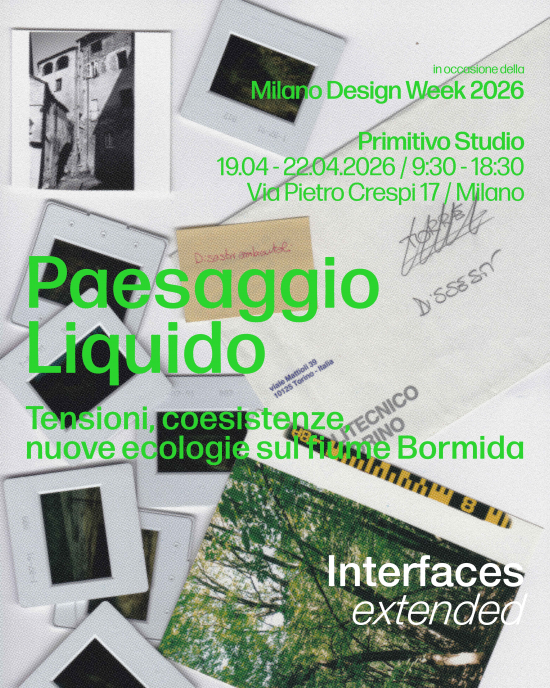 In occasione della Milano Design Week 2026, su invito di Primitivo Studio, Interfaces presenta, all’interno del programma extended, "Paesaggio Liquido": un’installazione dedicata al fiume Bormida, inteso come spazio di memoria, trasformazione e progetto. Un paesaggio espositivo che interroga il rapporto tra acqua, territorio ed ecologie, aprendo a nuove possibilità di coesistenza tra eredità del passato e futuri possibili.